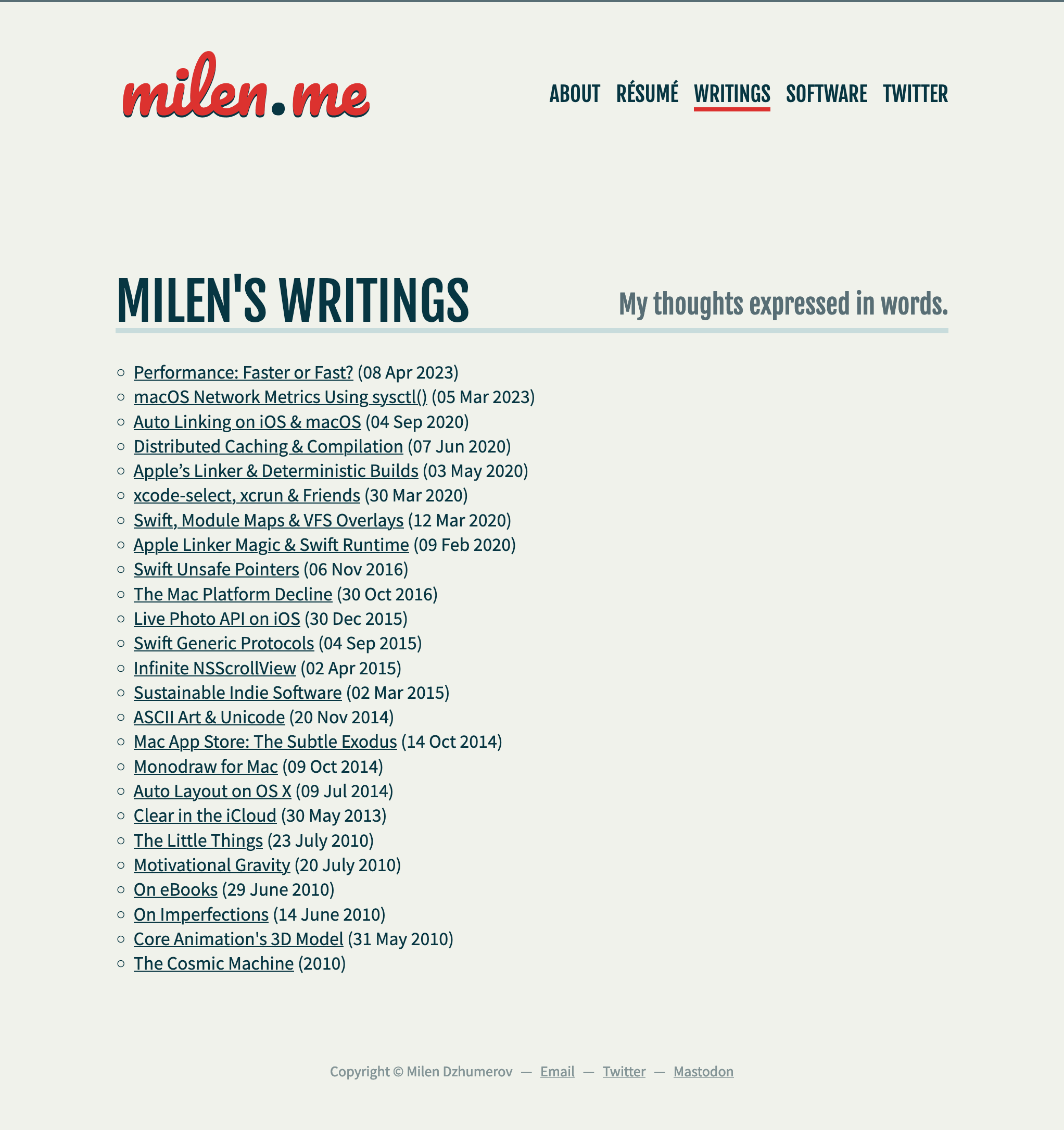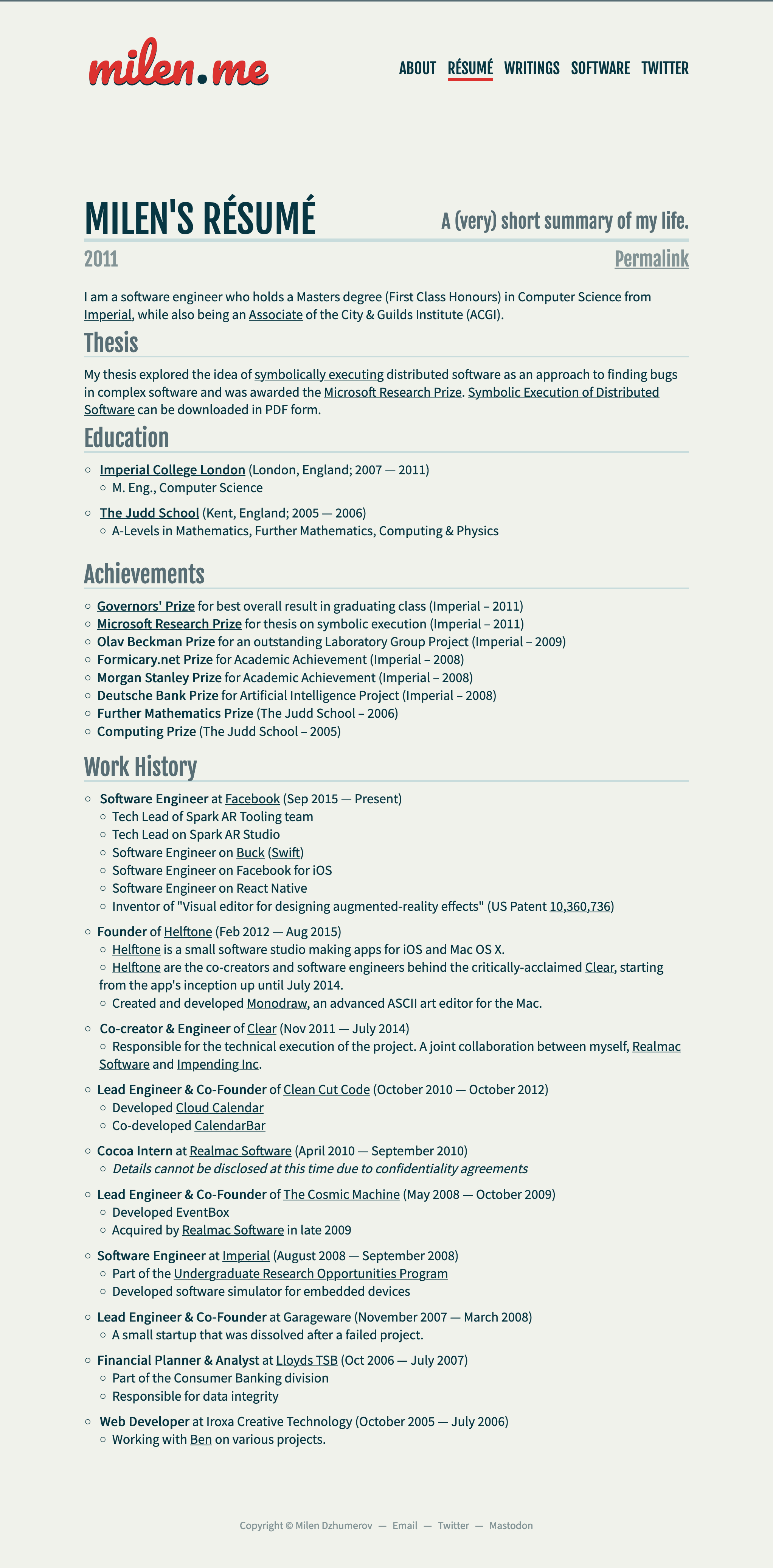 For archival purposes, I saved screenshots of the old design: About, Writings, Software, Resume.
