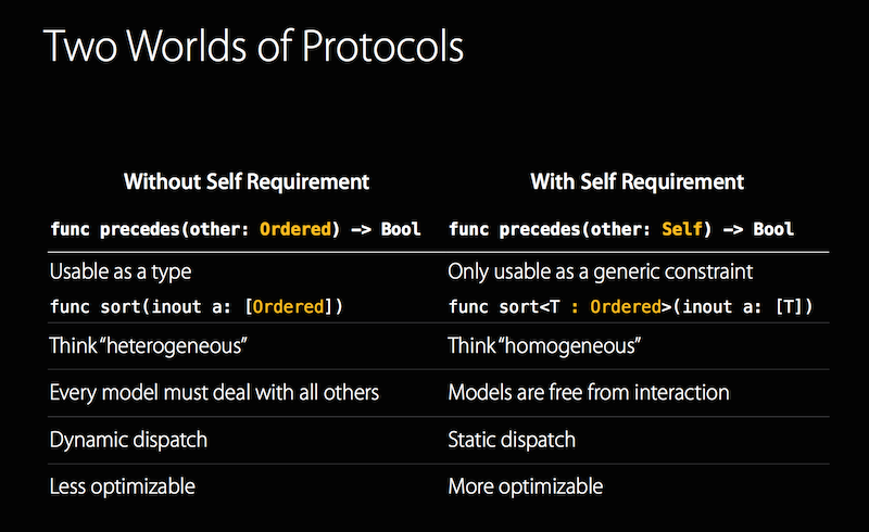 Watching the full video is highly recommended for any developers interested in Swift and the protocol-oriented approach. In particular, there’s a very good slide illustrating the consequence of adding a Self requirement to a protocol.